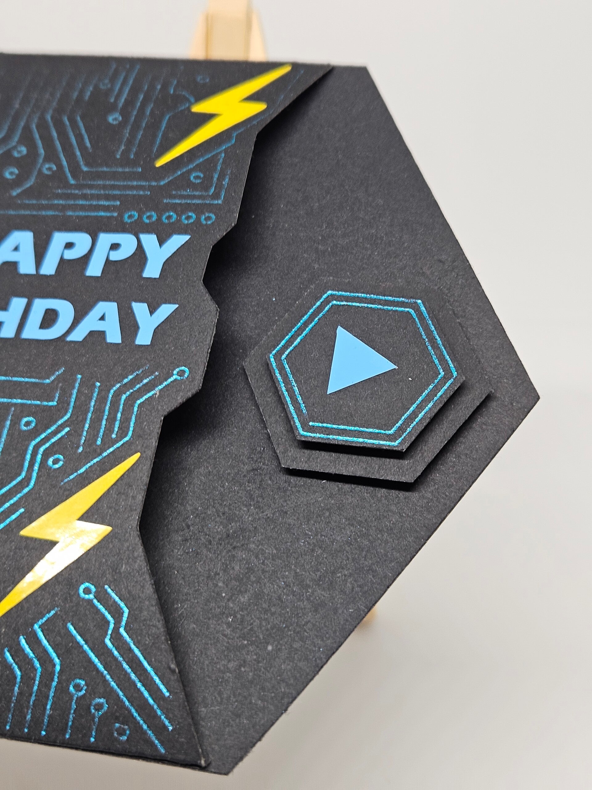 Carte artisanale en forme d’hexagone, fond noir avec motifs circuits bleus et éclairs jaunes.